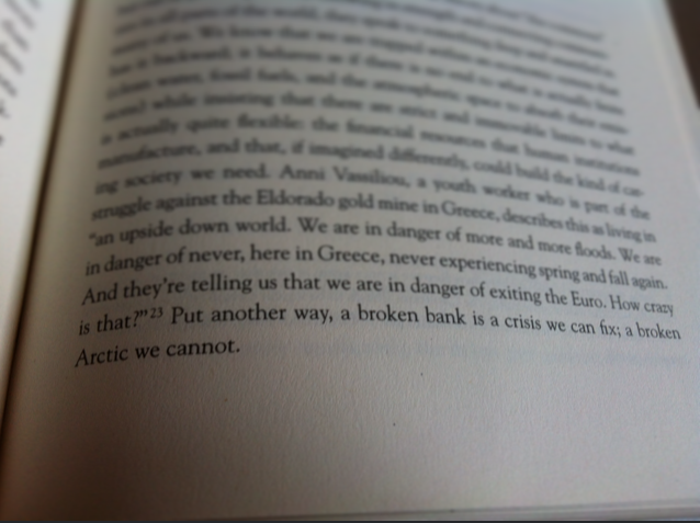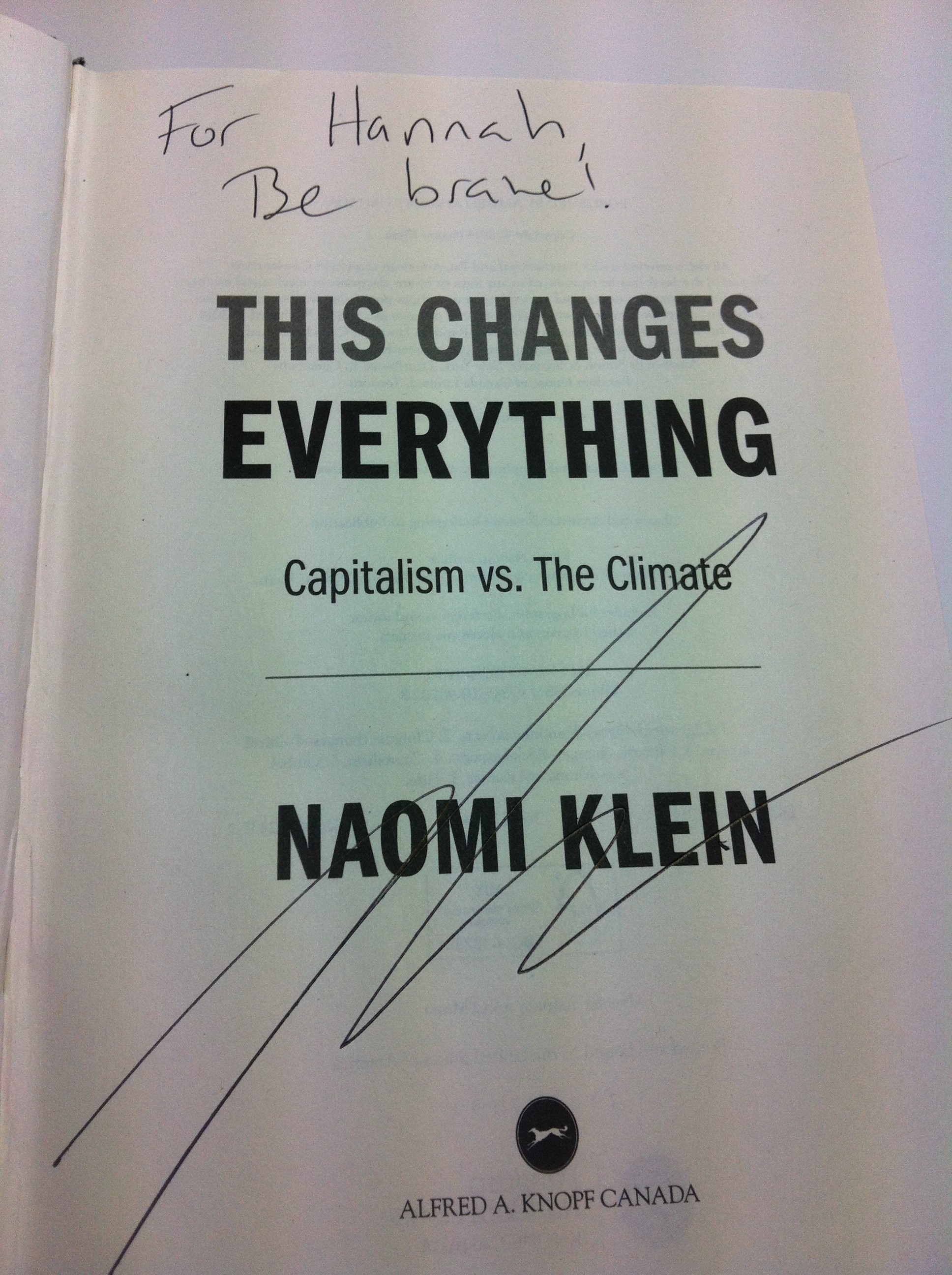 In the year since its publication, there has been significant changes. No, not everything, but much has changed. The price of oil has plunged. The Paris Agreement provided great precedent. Grassroots actions have grown. As I finished the Conclusion and closed the book, I felt the gravity of our point in history, but also hope for great change. I am buoyed by the words Klein wrote in my copy after speaking at the Winspear Centre in 2014. Simple, but powerful:
