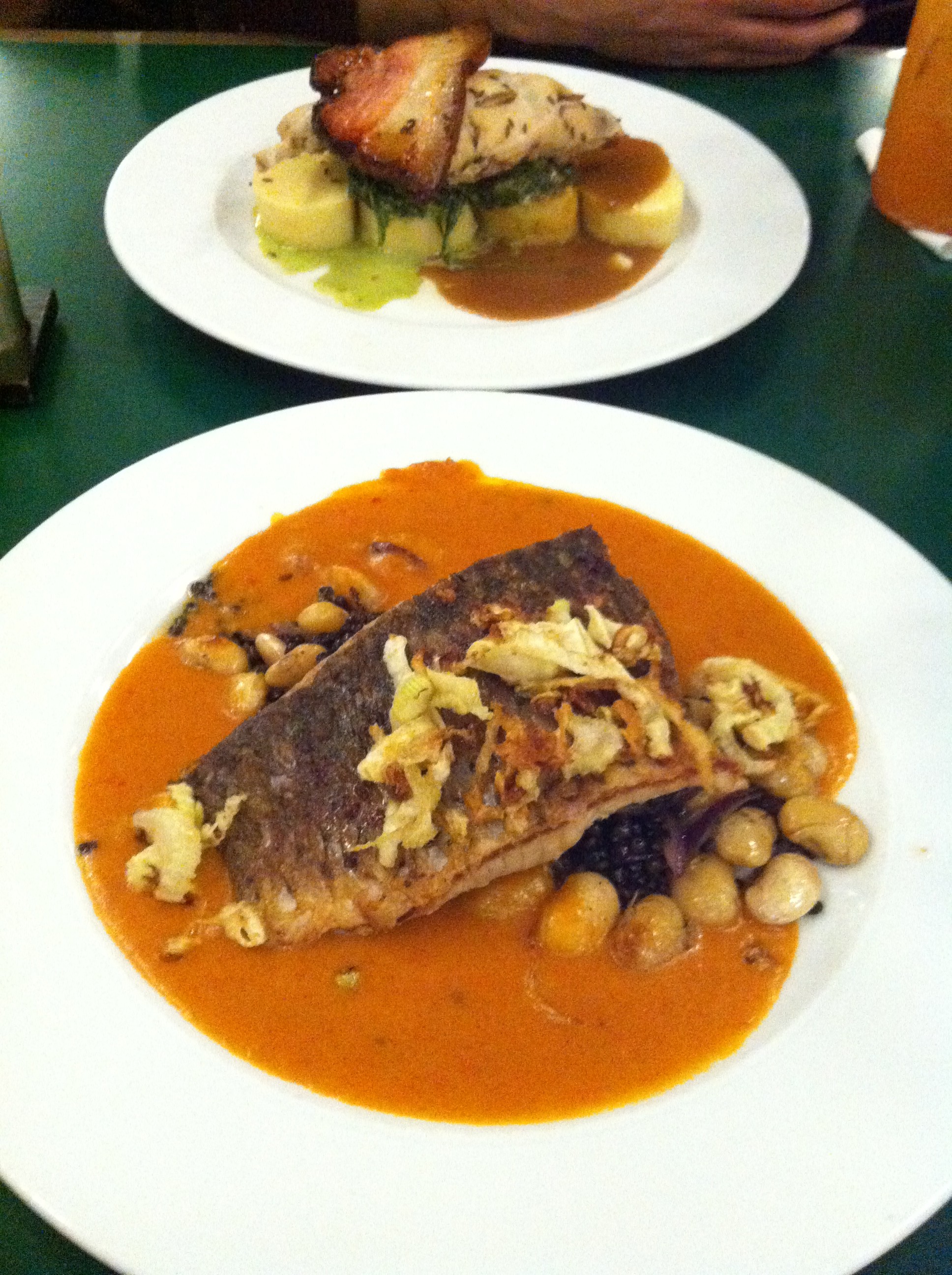In most of Central Europe, Christmas Eve is the most important day of the Christmas holidays. Following this tradition, Derek and I decided our big holiday meal would take place on the 24th. After too little research and a reservation at an into-the-thousands-down-the-review-list restaurant, we completed a flurried search and ended up at a nice pub in historic Vinohrady. Vinohradský Parlament‘s Christmas menu offered snail soup and if the locals eat snails at Christmas, you don’t say no. A hearty vegetable soup with small mussel-like bits that Derek decided were not of his liking. I happily finished the starter. For the main, carp was on the menu and was also an obvious yes. I had heard all about the Central European Christmas carp markets and stories of carps biding their time in bathtubs before their holiday appearance. Out came the fillet beautifully roasted and sitting on a bed of white beans, black lentils and red onions with a baked pepper sauce. I can see why carp is a holiday treat in Central Europe. The dish was rich and savoury and went very well with my half-litre of Staropramen Unfiltered. We rounded the meal out with house-made rhubarb ice cream (what?!) with pear mousse. Though the meal didn’t have Mum’s stuffing or Dad’s bad puns, it was a Christmas meal to remember.