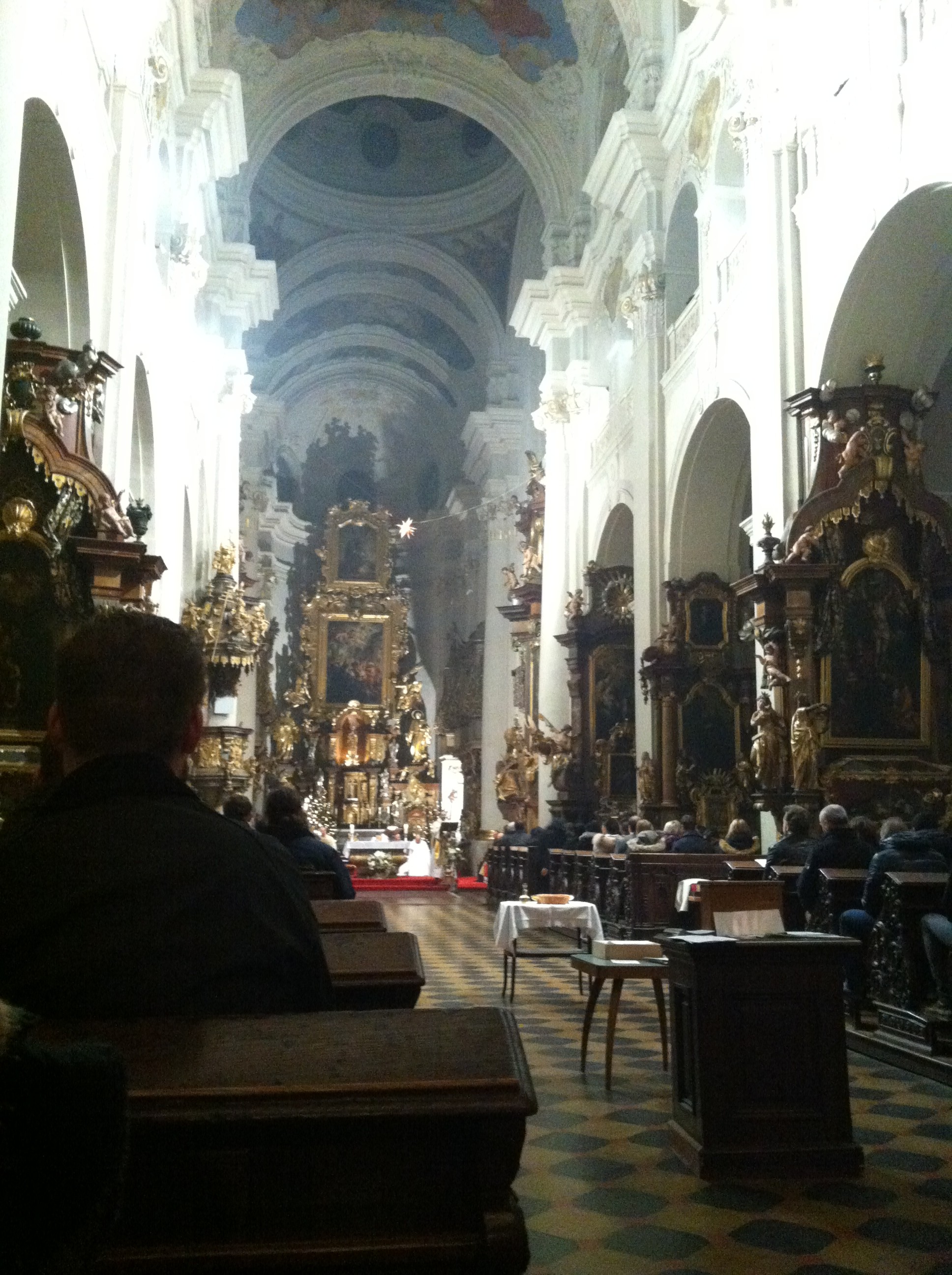 Prague is filled with dozens of beautiful churches and cathedrals. I know I overuse the term “awesome” as we North Americans are wont to do, but these churches truly are. Old Town Square alone boasts two impressive places of worship and its Church of Mother of God before Týn has steeples reaching 80 metres high. On Christmas Eve, it was a particularly special experience to attend midnight mass at theAugustinian St. Thomas Church. The church was, yes, awesome. It’s tucked away slightly given the more modern street grid, but upon entering, the 18th century ceiling frescos, the golden alters and the intricate wood work encasing majestic art pieces have their effect. Excuse the quality of the photo as well as my taking it, I could not resist capturing this moment. The mass was in Czech, English and Spanish, a neat combination of languages reflecting world religion and languages. The church itself is daunting but the feeling was festive with welcoming words and hymns that carried across languages.